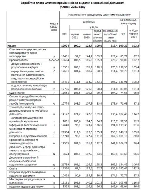 Найбільш оплачуваними у липні 2021 року були працівники підприємств та організацій з добування сирої нафти та природного газу (22 380 грн), державного управління й оборони, обов’язкового соціального страхування (21739 грн), фінансової та страхової діяльності (21 364 грн), з виробництва хімічних речовин і хімічної продукції (21 190 грн).