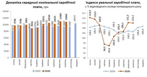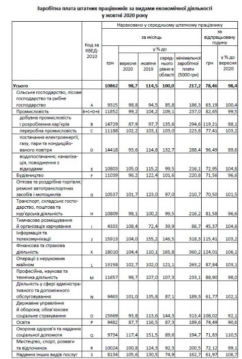 Порівняно з вереснем, середня зарплата одного працівника зменшилася на 1,3%, а з жовтнем 2019 року – зросла на 14,5%.