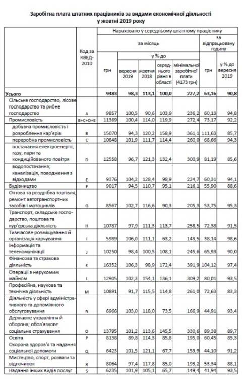 Найбільш оплачуваними у жовтні 2019 року були працівники підприємств та організацій фінансової та страхової діяльності (16 352 грн), з добування кам’яного та бурого вугілля (15 926 грн), з добування сирої нафти та природного газу (15 495 грн), державного управління і оборони, обов’язкового соціального страхування (13 795 грн).