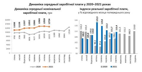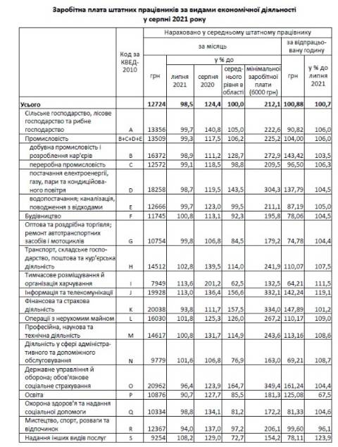 Найоплачуваними у серпні 2021 року були працівники підприємств та організацій з добування сирої нафти та природного газу (22 952 грн), державного управління й оборони, обов’язкового соціального страхування (20 962 грн), фінансової та страхової діяльності (20 038 грн), інформації та телекомунікації (19 928 грн), з виробництва хімічних речовин і хімічної продукції (19 643 грн).