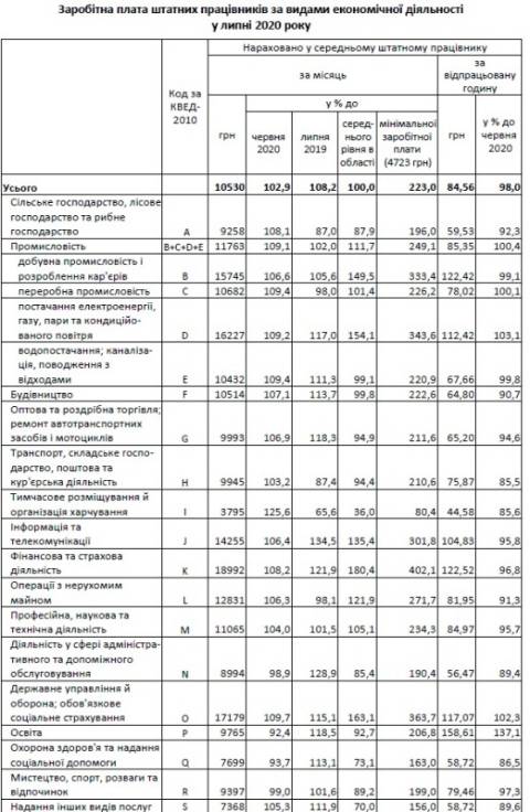 Найбільш оплачуваними у липні були працівники підприємств та організацій з виробництва хімічних речовин і хімічної продукції (21 100 грн), фінансової та страхової діяльності (18 992 грн), з добування сирої нафти та природного газу (18 781 грн), державного управління й оборони, обов’язкового соціального страхування (17 179 грн).