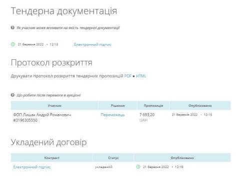 Аукціон стартував сьогодні, 21 березня, участь у ньому взяв лише підприємець Андрій Лишак, якого й оголосили переможцем. Очікувана вартість послуг становила 7 693,20 грн. Тендер оголосили вже після введення воєнного стану в Україні.