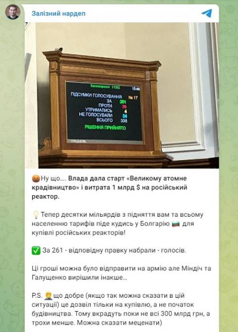 "Влада дала старт "Великому атомному крадівництву" і витратила 1 млрд доларів на російський реактор. Тепер десятки мільярдів з підняття вам та всьому населенню тарифів піде кудись у Болгарію для купівлі російських реакторів" – заявив Железняк.