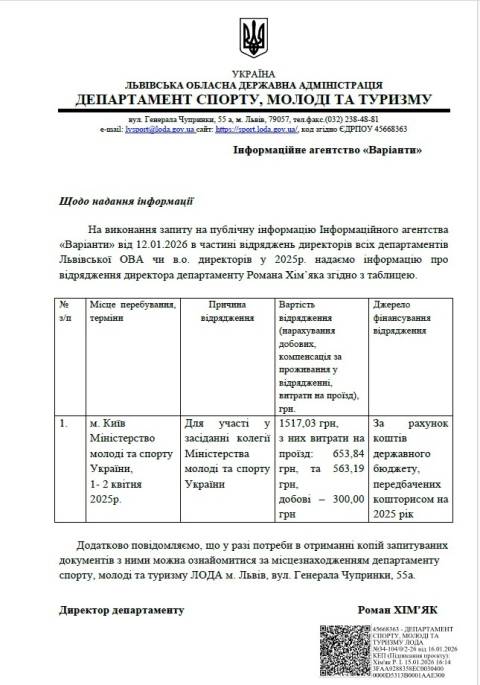 Директор департаменту спорту, молоді та туризму Львівської ОВА Роман Хім’як торік побував у одному відрядженні у Києві. Він 1-2 квітня взяв участь у засіданні колегії Міністерства молоді та спорту України.
