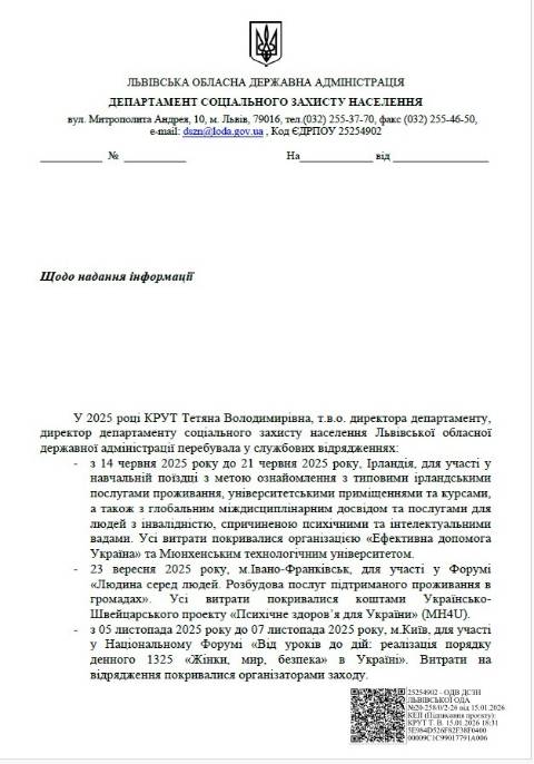 Директорка департаменту соціального захисту населення Львівської ОВА Тетяна Крут торік побувала у 3 відрядженнях, серед них одне закордонне до Ірландії.