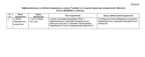 Торік директор департаменту фінансів Львівської ОВА Олег Демків мав лише одне відрядження. Зокрема, з 5 до 10 серпня він проходив стажування у Маршалківському управлінні Підкарпатського воєводства для участі у навчанні з питань фондів Європейського Союзу та впровадження проєктів ЄС (м. Жешів, Польща).