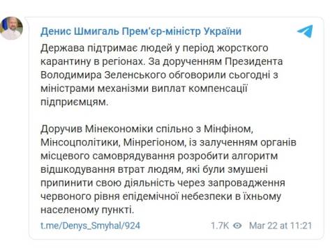 "Доручив Мінекономіки спільно з Мінфіном, Мінсоцполітики, Мінрегіоном, із залученням органів місцевого самоврядування розробити алгоритм відшкодування втрат людям, які були змушені припинити свою діяльність через запровадження червоного рівня епідемічної небезпеки в їхньому населеному пункті", – написав Денис Шмагаль.