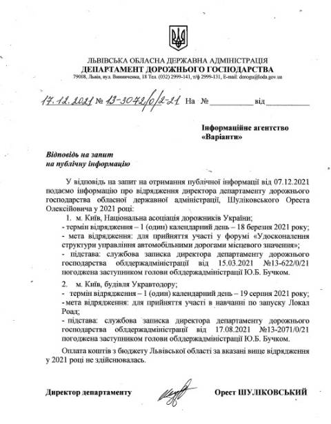 У 2021 році директор департаменту дорожнього господарства Львівської ОДА Орест Шуліковський не отримав виплат з бюджету Львівської області за два відрядження. Зазначимо, Шуліковський їздив у: