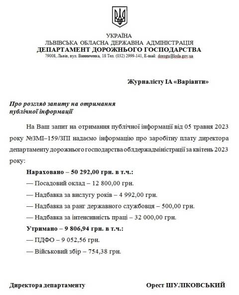 У квітні директору департаменту дорожнього господарства Львівської ОВА Оресту Шуліковському нарахували 50 тисяч гривень зарплати.