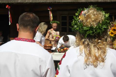 Власне, ритуальна шлюбна церемонія, яку представили сьогодні працівники Музею, є своєрідною адаптацією народних традицій до вимог управління юстиції. Як наприклад, заквітчані снопи – компроміс між автентичними деревцями та стовпчиками з гірляндами, які пропонували чиновники.