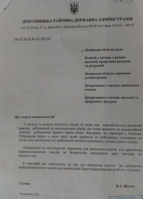 Дрогобицька районна державна адміністрація надіслала до Львівської обласної ради і департаментів облдержадміністрації лист про загрозу виникнення надзвичайної ситуації.