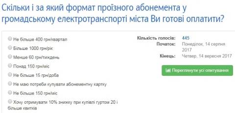 Наразі проголосувало понад 400 людей. Найбільше львів'ян, а це майже 35% опитаних, відповіли, що готові платити за проїзд в електротранспорті не більше 150 гривень у місяць.
