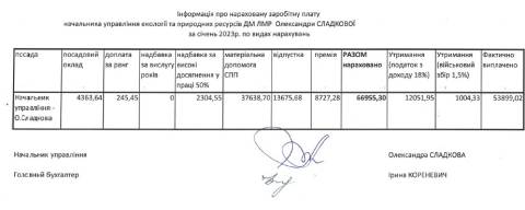 У січні цього року начальниці управління екології та природних ресурсів Львівської міської ради Олександрі Сладковій нарахували 66 955,30 грн заробітної плати. Зокрема, у цю суму увійшли такі виплати: