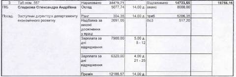 У січні цього року Сладковій нарахували 66 тис. грн зарплати, у лютому – 69 тис. грн, у березні – 24 тис. грн.