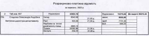 У вересні заступниці директора департаменту економічного розвитку міськради Олександрі Сладковій нарахували 42 тисячі гривень зарплати.