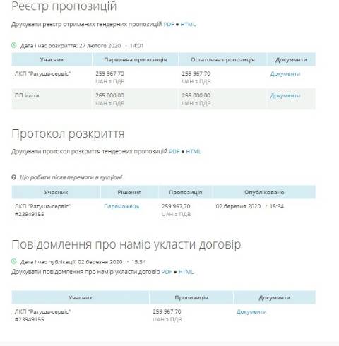 Аукціон стартував 26 лютого, участь у ньому взяли ЛКП "Ратуша-сервіс" та ПП "Ігліта", які запропонували послуги з автомобільних перевезень за 259 967,70 грн та 265 000 грн відповідно. Переможцем обрали комунальне підприємство, а очікувана вартість послуг становила 265 000 грн.