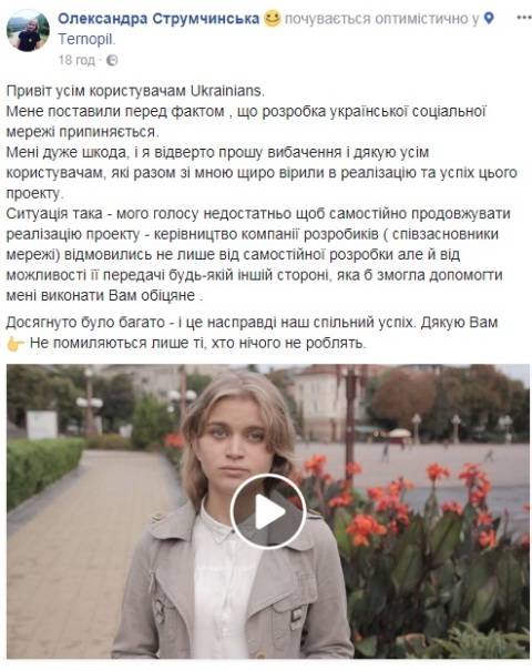 Як заявила Олександра Струмчинська, розробка української соціальної мережі Ukrainians припиняється.