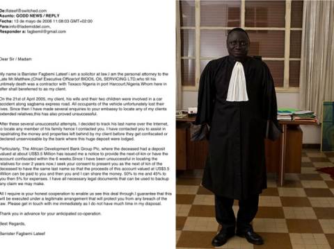 Або юрист Фагбемі Латіф, що розшукує родичів свого багатого клієнта, який мав необережність відійти у кращий світ без чіткого заповіту. Знову ж таки, чудесним чином, у містера Латіфа не має сумнівів у тому, що законний спадкоємець саме ви.