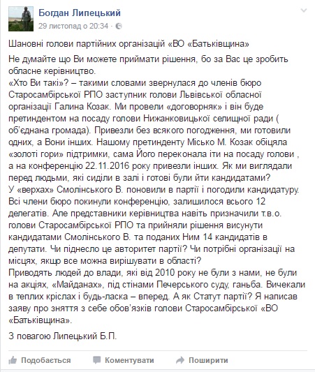 Так, Степан Правда пише про те, що нардеп-бппіст Лопушанський підтримує одного кандидата, на противагу депутату-бппісту з обласної ради Михайлові Гичці. Та зрозуміти конкретно хто кого підтримує вдається не одразу.