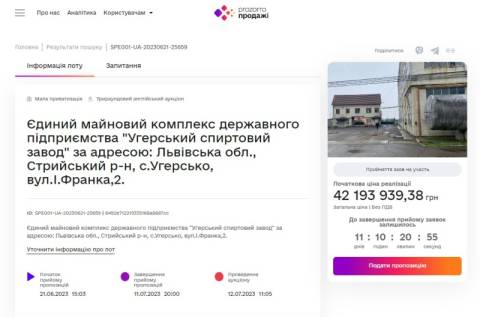 Фонд держмайна виставив на продаж у системі ProZorro Угерський спиртовий завод, що знаходиться на вул. І.Франка, 2 у селі Угерсько Стрийського району, за 42 193 939,38 грн.