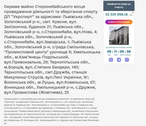 До складу "Сторонибабського місця провадження діяльності та зберігання спирту ДП "Укрспирт" входять, зокрема, адмінбудинки, спиртопідвали, артсвердловини, солодовня, котельня, спиртосховища, депо, протирадіаційне укриття, тощо, які знаходяться на земельних ділянках у Золочівському районі Львівської області (вул. Залізнична, 21 у смт. Красне; вул. Нова, 4, вул. Заводська, 1 у с. Сторонибаби; в урочищі 9 Смільнівської сільради), у Хмельницькій області (м. Кам'янець-Подільський, вул. Привокзальна, 29), у Тернопільській області (м. Борщів, вул. Степана Бандери, 140; смт Дружба, станція Микулинці-Струсів, вул Лесі Українки, 9г), у Волинській області (м. Луцьк, вул. Ковельська, 67) у Віннцькій області (с. Дружне, вул.Промислова, 25).