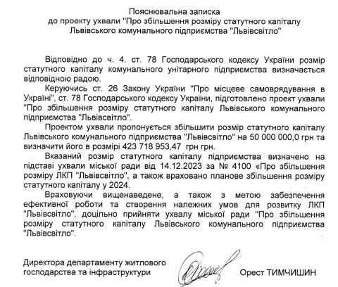 "Збільшити розмір статутного капіталу ЛКП "Львівсвітло" на 50 000 000 грн та встановити його у розмірі 423 718 953,47 грн" – йдеться у документі.