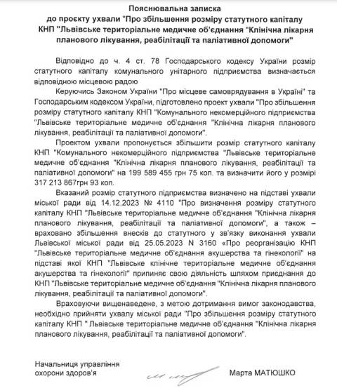 "Збільшити розмір статутного капіталу КНП "Львівське територіальне медичне об’єднання "Клінічна лікарня планового лікування, реабілітації та паліативної допомоги" на 199 589 455 грн 75 коп. та визначити його у розмірі 317 213867 грн 93 коп." – вказано у документі.