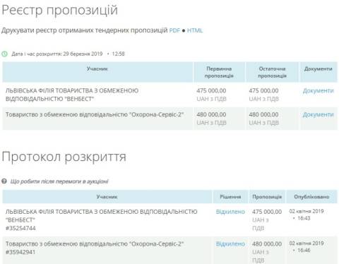Аукціон стартував 29 березня, у ньому взяли участь ТзОВ "Охорона-Сервіс-2" і Львівська філія ТзОВ "Венбест", однак їх пропозиції відхилили через те, що вони не відповідали умовам тендерної документації. Додамо, очікувана вартість послуг становила 480 000 грн.