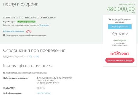 Львівське комунальне підприємство "Транспортна фірма "Львівспецкомунтранс" оголосило тендер у системі ProZorro на послуги охорони, які переможець тендеру має надавати з 12 квітня до 31 грудня 2019 року.