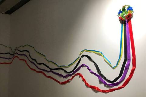 В останній залі картини відсутні, за те є щось на кшталт перформансу: віночок з довгими стрічками, біля якого Давид Чичкан відповідав на питання авдиторії про національну ідею, свідомість та, звісно, про стрічки й трикутники.