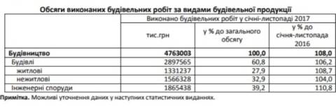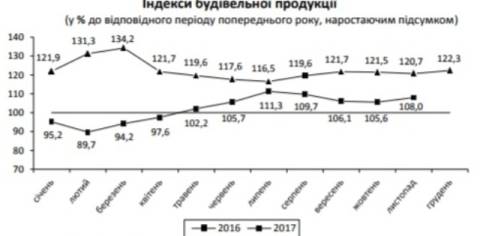 Відтак, індекс будівельної продукції у січні-листопаді 2017 року становив 108%, порівняно з цими ж місяцями 2016 року.