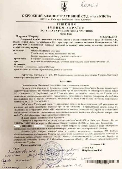 Сьогодні Окружний адміністративний суд Києва визнав протиправними дії Українського інституту національної пам'яті та його екс-голови Володимира В'ятровича щодо надання висновку про те, що символіка 14-ї гренадерської дивізії військ СС "Галичина" не є символікою націонал-соціалістичного (нацистського) тоталітарного режиму, поширення або публічне використання якої в Україні заборонено.