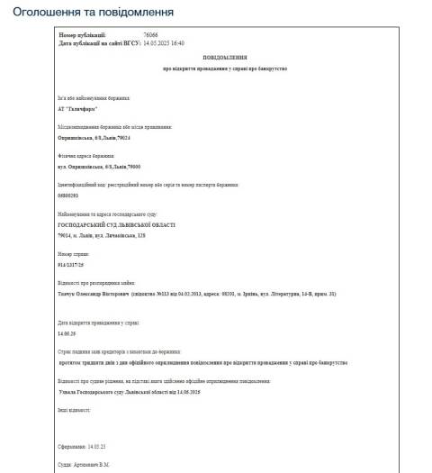 Згідно з інформацією на сайті Верховного Суду, Господарський суд Львівської області 14 травня цього року відкрив провадження про банкрутство АТ "Галичфарм", що входить до фармацевтичної корпорації "Артеріум" й знаходиться у Львові.