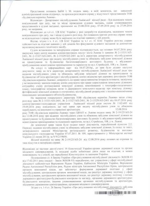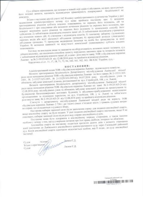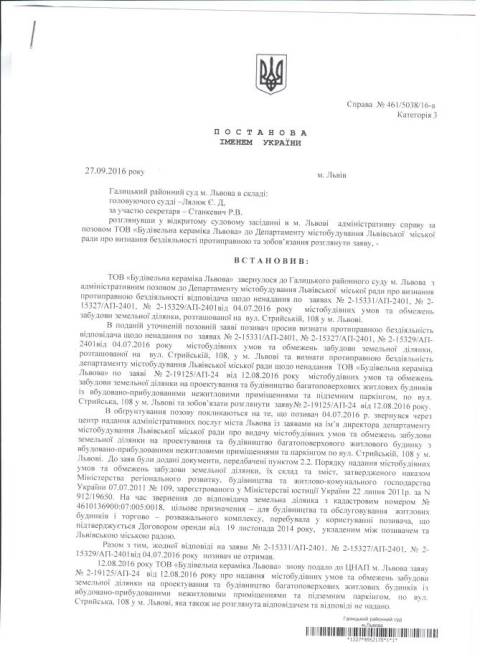Окрім того, суд зобов’язав розглянути документи ТОВ «Будівельна кераміка Львова» та прийняти рішення щодо видачі містобудівних умов та обмежень на забудову земельної ділянки по вул. Стрийській, 108.