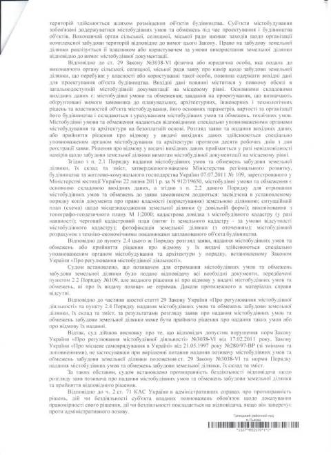 «Судом встановлено, що позивачем для отримання містобудівних умов та обмежень забудови земельної ділянки було подано відповідачу всі необхідні документи, передбачені пунктом 2.2 Порядку №109, але жодного рішення ні про відмову у видачі містобудівних умов та обмежень, ні про їх видачу позивач не отримав. Докази протилежного в матеріалах справи відсутні.