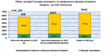 Офіційних трансфертів у 2015 році заплановано одержати обласним бюджетом з державного бюджету за загальним і спеціальними фондами на суму 5733675,3 тис. грн., з них за загальним фондом – 5728625,0 тис. грн., спеціальним фондом – 5050,3 тис. гривень. Порівняно з обсягами на 2014 рік вони збільшаться на 407568,4 тис. грн. або 7,7 відсотка, 2013 рік - на 1117556,3 тис. грн. або 24,2 відсотка.