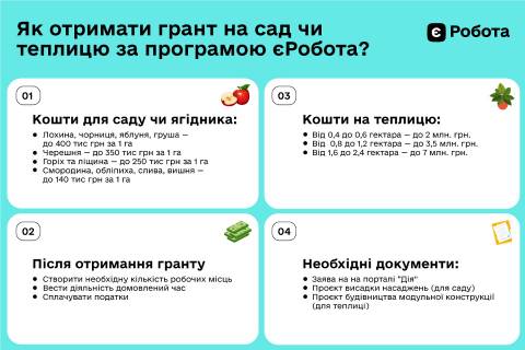 Завдяки урядовій програмі безповоротних грантів єРобота можна започаткувати сад, виноградник, ягідник чи теплицю. Від запуску програми у липні минулого року держава вже схвалила 98 грантів на понад 472 мільйони гривень. Регіони-лідери за площею садів та теплиць – Закарпаття, Київщина та Львівщина. А культурами, які найчастіше обирали українці, стали фундук, волоський горіх, лохина, чорниця та яблуні.