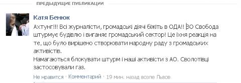 Також у Фейсбук з'явилась інформація від студенки УКУ Катерини Бенюк про те, що Свобода виганяє громадський сектор з Львівської ОДА.