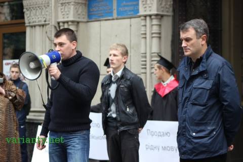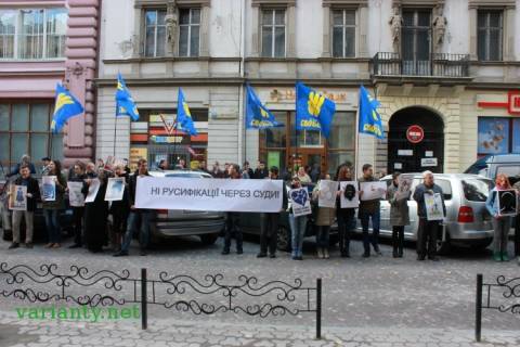 Нардепи від ВО "Свобода" Андрій Міщенко та Юрій Михальчишин спільно з активістами Львівської міської організації ВО "Свобода" пікетують Шевченківський районний суд Львова у зв’язку з неправомірним рішенням у справі за позовом комуніста О.Зубчевського проти Ірини Фаріон.