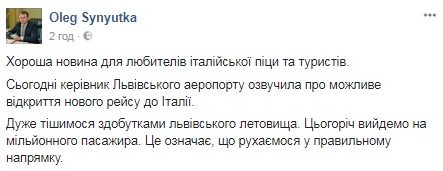 "Дуже тішимося здобутками львівського летовища. Цьогоріч вийдемо на мільйонного пасажира. Це означає, що рухаємося у правильному напрямку", – написав Олег Синютка.