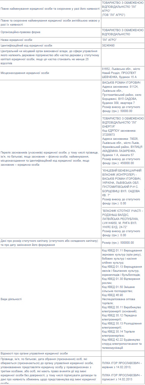 Зазначимо, що власниками "Ліг-Агро" є Роман Васьків та Ігор Пілка.