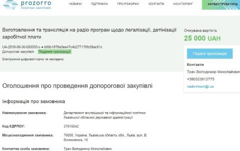 Відтак, департамент внутрішньої та інформаційної політики Львівської обласної державної адміністрації проводить закупівлю на виготовлення та трансляцію на радіо програм щодо легалізації, детінізації заробітної плати.