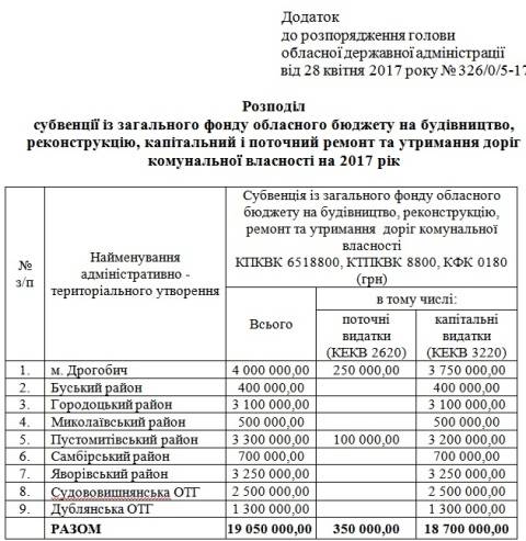 За ці кошти відремонтують дороги у 6 районах області, Дрогобичі та двох об'єднаних громадах.
