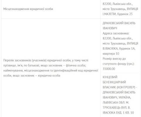 Як йдеться у єдиному державному реєстрі юридичних осіб, ТзОВ "Прикарпатська будівельна компанія" зареєстровала у Трускавці, її засновником та власником є Василь Драновський, а займається фірма будівництвом, продажем будматеріалів, виготовленням бетону для будівництва.