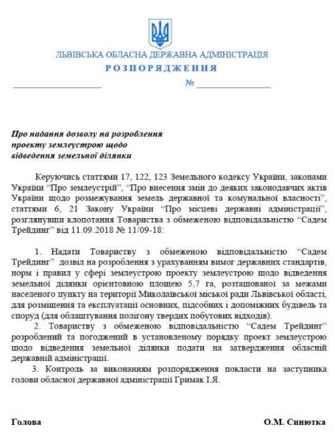 Вчора голова Львівської обласної державної адміністрації Олег Синютка дозволив ТОВ "Садем Трейдинг" розробити проект землеустрою на ділянку на території Миколаївської міськради для облаштування полігону твердих побутових відходів.