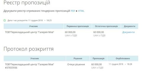 Аукціон стартував 11 грудня, на нього подався лише один учасник – ТОВ "Перекладацький центр "Галерея Мов", який запрропонував надати перекладачів за ціну, встановлену облдержажміністрацією – 60 000 грн.