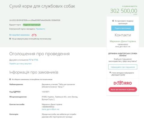 Табір для тримання військовополонених "Захід 1" замовив корм для службових собак за 300 тисяч гривень.
