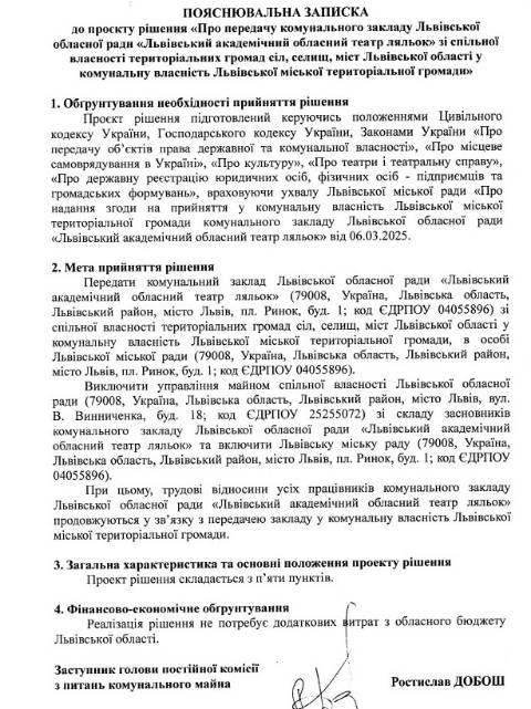 Згідно з проєктом рішення, Театр ляльок, що на площі Данила Галицького, 1, передається у комунальну власність міської ради Львова для зменшення орендної плати. Зокрема, приміщення, в яких він розташовується, є у власності міста й заклад повинен платити орендну плату місту за користування ними. Через це театр "несе значні витрати", тому передача закладу у власність громади Львова є "логічною та доцільною".