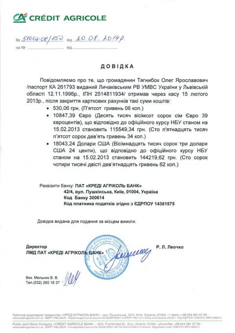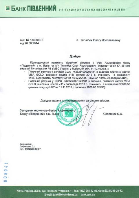Між тим, "Свобода" пояснила, що Тягнибок окремо не поповняв банківський рахунок на 251 488,6 грн., а лише перевів депозити з банку «Креді Агріколь Банк» до банку «Південний». Відповідні операції зафіксовані у декларації нардепа, і підтверджуються документами відповідних банків (подаються нижче).