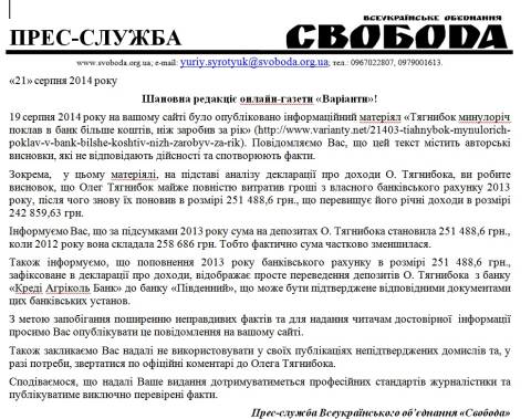 У прес-службі спростували інформацію про те, що Олег Тягнибок минулоріч поклав в банк більше коштів, ніж заробив за рік. Спростування подаємо нижче у вкладених файлах.